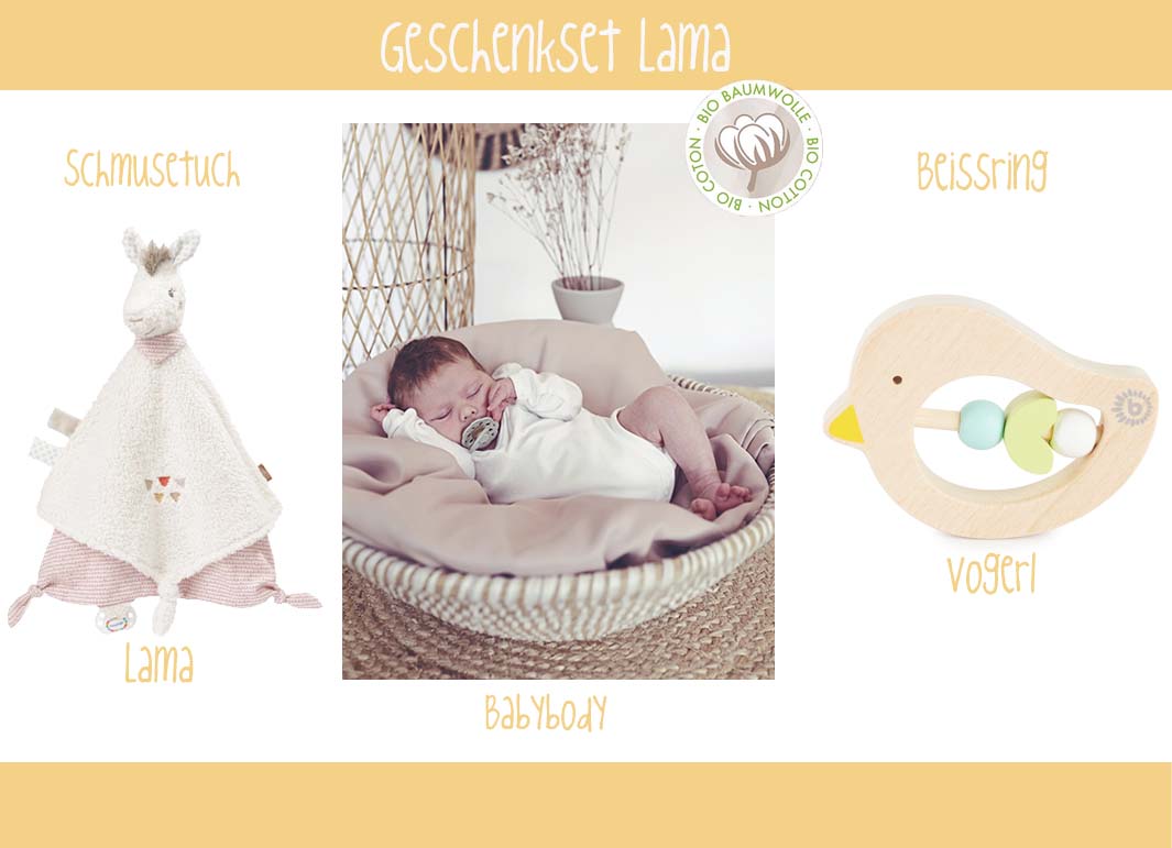 Babybody, Schmusetuch Lama, Beißring Vogel